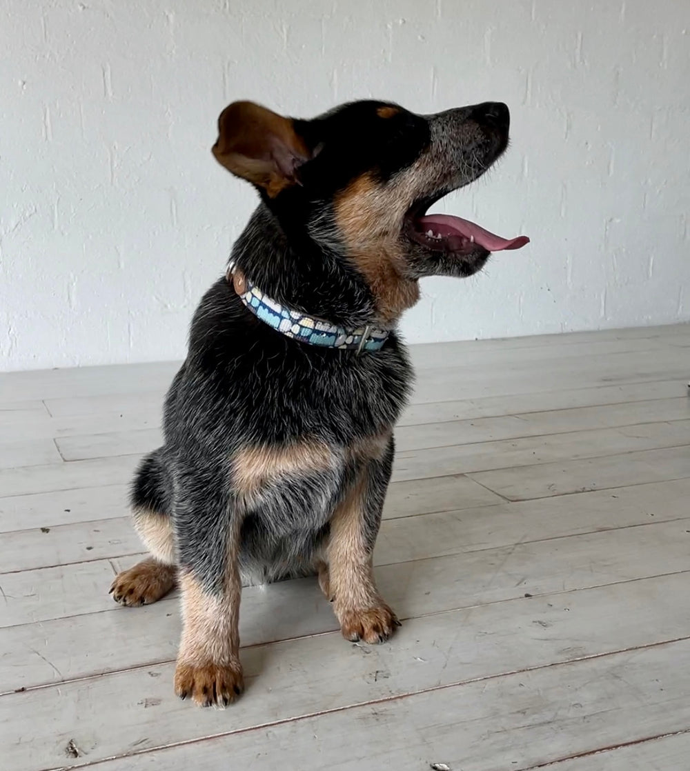 Our luxurious dog collars are made from soft, thick leather and finished with the beautiful, Indigenous artwork 'Puli Puli Rocks' by Keturah Zimran from the Ikuntji Artists Centre near Alice Springs.